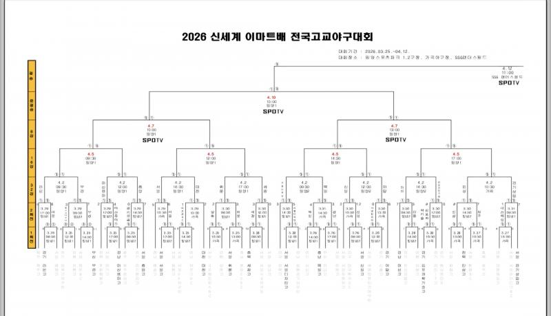 2026 신세계 이마트배 전국고교야구대회 4일(토) 경기가 우천으로 취소되었다. 취소된 경기는 5일(일) 같은 장소에서 벌어진다. ◎경기안내(5일) <1루> <..