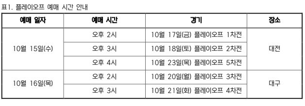 KBO는 10월 17일(금)부터 열리는 삼성 라이온즈와 한화 이글스의 2025 신한 SOL뱅크 KBO 플레이오프 입장권 예매를 10월 15일(수) 오후 2시부터 진행한다. 플레이오프 입장권은 포스트시즌 입장권 단독 판매사인 NOL 티켓 예매 홈페이지(https:..
