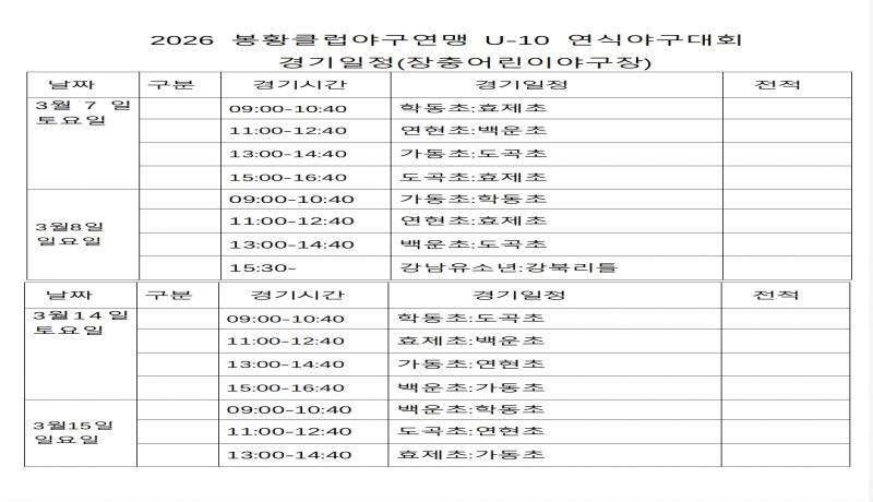 - 3월 7일(토) 장충어린이야구장에서 개막 2026 봉황클럽야구연맹 춘계 U-10 연식야구대회(주최:봉황클럽야구연맹)의 일정이 확정되었다. 연맹은 3일(화) 장충어린이야구장에서 감독자회의를 열고 대진추첨을 진행했다. 이번 대회는 3월..