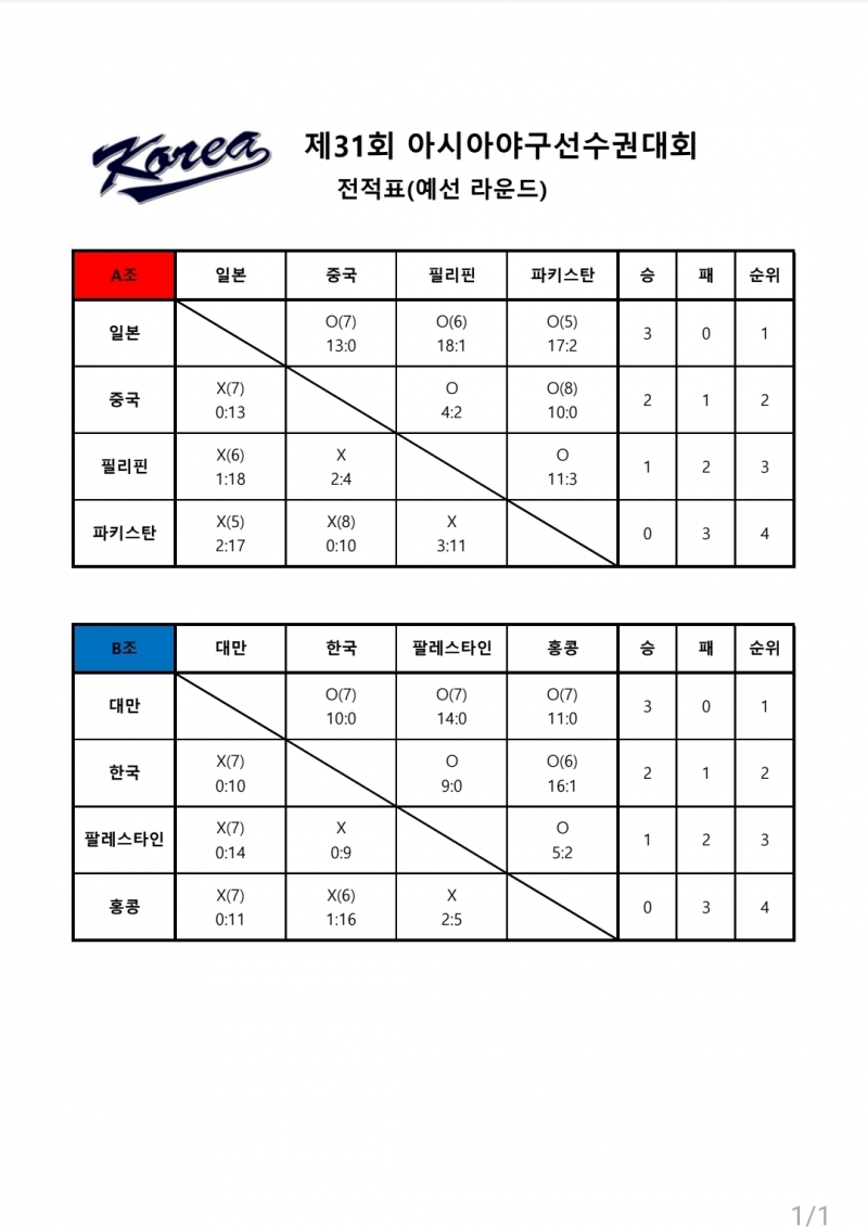 제31회 아시아야구선수권대회(중국, 핑탄)에 참가하고 있는 대한민국 국가대표 선수단이 예선라운드 마지막 경기(24일)에서 팔레스타인을 상대로 9-0으로 승리하며 B조 2위로 슈퍼라운드에 진출했다.