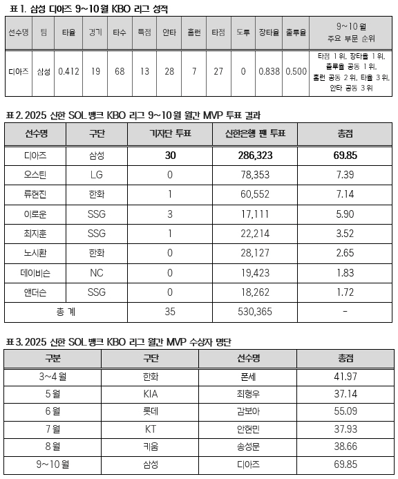삼성 디아즈가 2025 신한 SOL뱅크 KBO리그 9~10월 월간 MVP로 선정됐다. 디아즈의 개인 첫 월간 MVP 수상이자, 삼성 외국인 타자로서는 첫 수상이다.