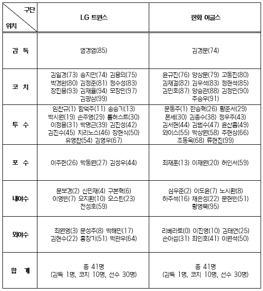 한국시리즈 1차전 시구에는 1982년 세계야구선수권대회 일본과의 결승전에서 8회말 동점을 만들었던 개구리 번트의 주인공이자, 1990년 LG 트윈스 우승 멤버인 김재박이 나선다. 김재박은 유격수 부문에서 다섯 차례 골든글러브를 수상하는 등 KBO 유격수 계보의 시작을 알렸으며, 2007년부터 2009년까지 LG 트윈스 감독으로 팀을 이끌었다.