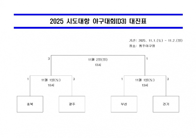 대한야구소프트볼협회(회장 양해영, KBSA)가 주최하는 ‘2025 시도대항 야구대회(D3)’의 결선이 오는 11월 1일(토)부터 2일(일)까지 충북 청주야구장에서 개최된다.