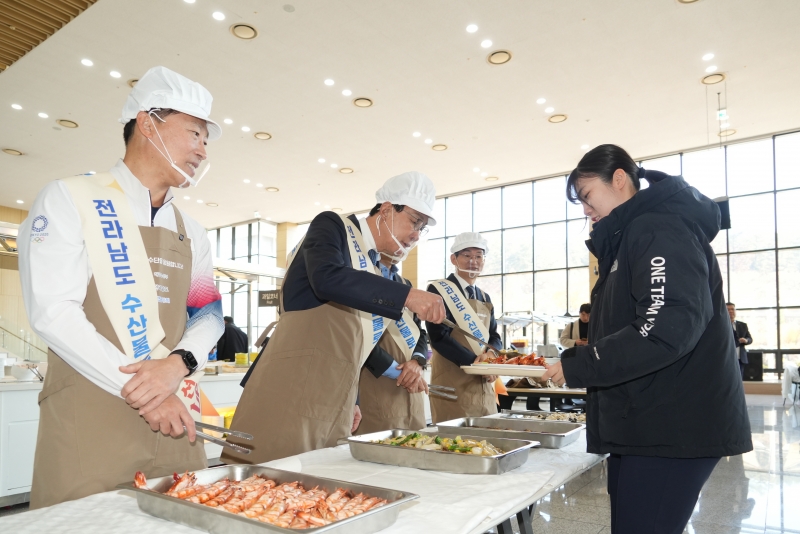 이날 국가대표선수촌 선수식당에서는 전라남도 특산 수산물인 전복, 생굴, 문어, 새우, 민어, 민물장어, 참조기 등 다양한 해산물이 중식 메뉴로 제공되었다. 김택수 국가대표선수촌장, 노동진 수협중앙회장 등 관계자들은 싱싱하고 고품질의 수산물로 구성된 특식을 국가대표 선수들에게 직접 배식하며 격려했다.