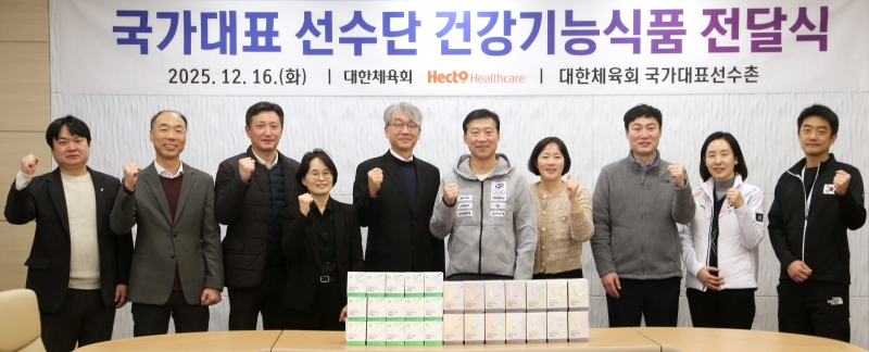 대한체육회(회장 유승민)는 12월 16일(화) 오전 10시 30분 진천 국가대표선수촌에서 헥토헬스케어(대표 김석진)와 건강기능식품 전달식을 개최하고 총 1억 800만원 상당의 물품을 전달받았다.