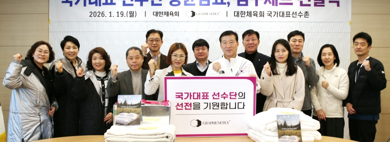 대한체육회(회장 유승민)는 1월 19일(월) 오전 11시 진천 국가대표선수촌에서 ㈜그래핀올(대표 유희준, 김기수)과 총 1,790만원 상당의 리버커리담요 외 패브릭 제품 전달식을 개최했다.