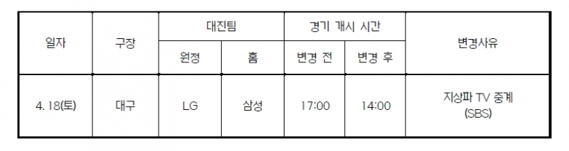 2026 KBO리그 경기 중 일부 경기의 개시 시간이 다음과 같이 변경됐다.