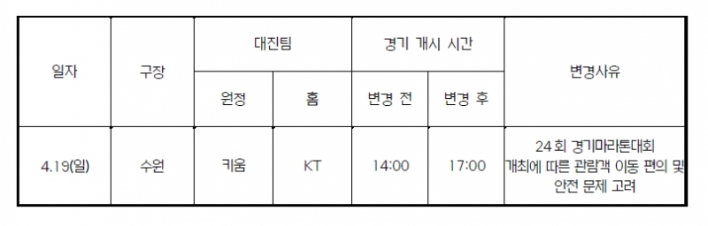 2026 KBO리그 경기 중 4월 19일(일) 수원 구장 경기의 개시 시간이 다음과 같이 변경됐다.