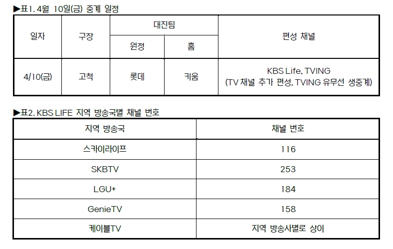4월 10일(금) 오후 6시 30분부터 고척에서 열리는 KBO리그 롯데-키움의 경기가 KBS Life 채널에 편성돼 생중계될 예정이다.