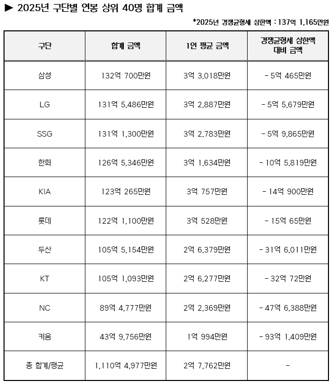 KBO는 12월 18일(목) 2025년 구단별 연봉 상위 40명의 합계 금액을 발표했다. KBO는 리그 전력 상향 평준화와 지속적인 발전을 위해 2023년부터 경쟁균형세 제도를 도입해, 2021 ~2022년 구단별 연봉 상위 40명(외국인선수와 신인선수를 제외한 ..
