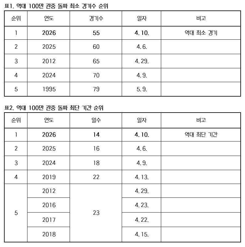 - 역대 최소 경기인 55경기만에 100만 관중 달성, 종전 기록 2025시즌 60경기에서 5경기 단축 - 14일만에 100만 돌파로 역대 최단 기간 신기록도 경신 2026 신한 SOL KBO리그가 10일 열린 잠실, 고척, 수원, 대전, 대구 경기..