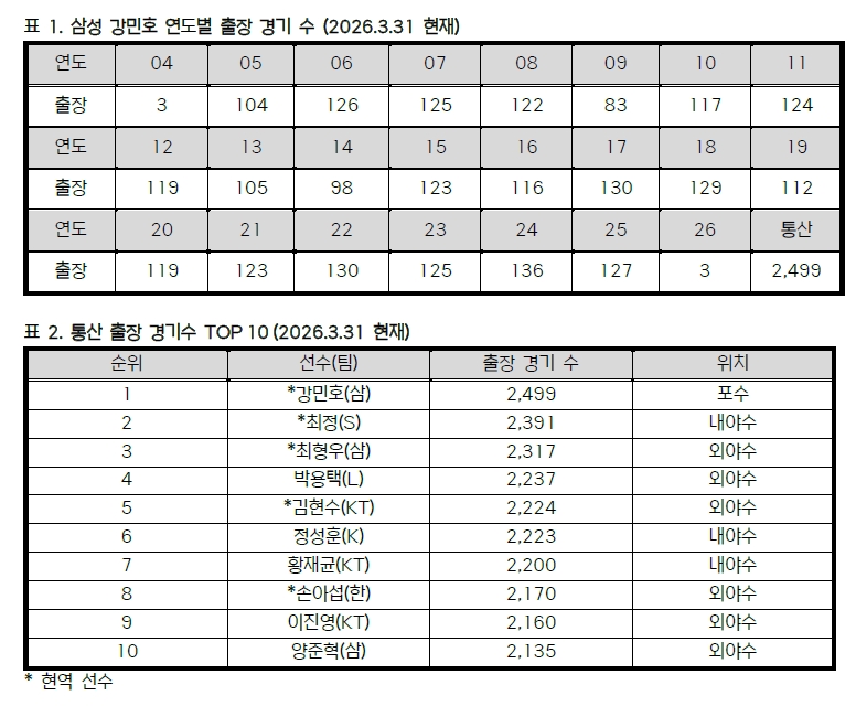 삼성 강민호가 KBO리그 최초 2,500경기 출장까지 단 한경기만 남겨두고 있다. 강민호는 2004년 9월 19일 사직 현대전에서 데뷔전을 치렀다. 2005년부터 본격적으로 출장 기록을 쌓기 시작한 강민호는 2009년 4월 26일 사직 LG전에서 500경기, 20..