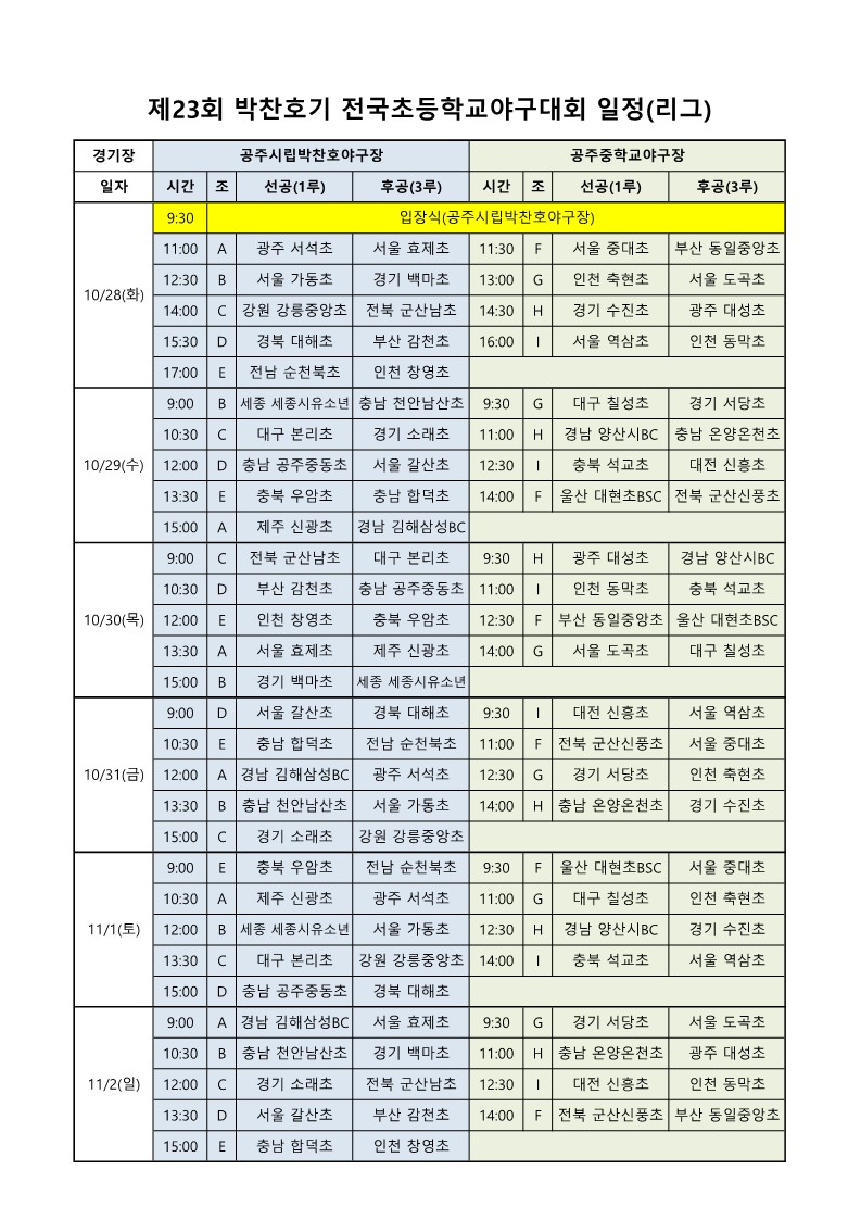 ◇첫날 전적(28일) ▲공주 시립야구장 광주 서석초 2-7 서울 효제초 서울 가동초 8-4 경기 백마초 강원 강릉중앙초 1-18 전북 군산남초 <4회콜드게임> 경북 대해초 4-5 부산 감천초 전남 순천북초 4-6 인..