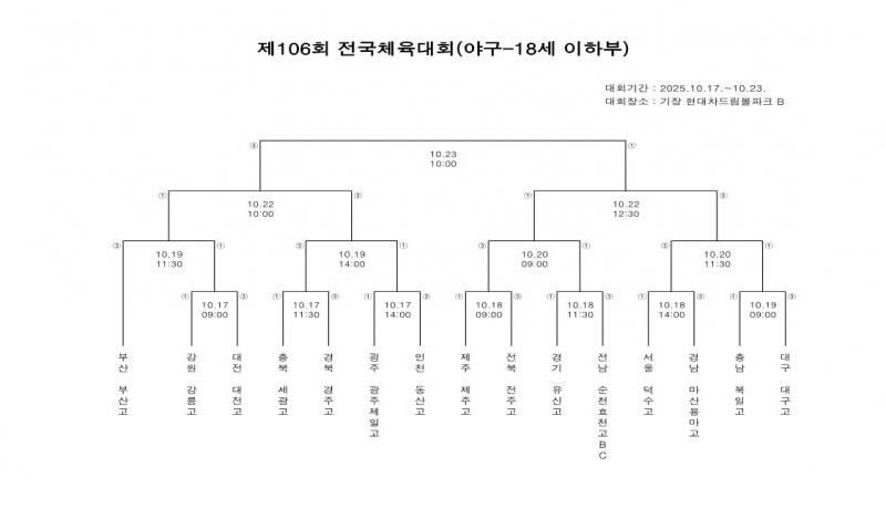 제106회 전국체육대회 야구(18세 이하부)가 17일(금) 기장 현대차드림볼파크 보조2구장에서 개막한다. ◎경기안내(17일) <1루> <3루> ◇16강전 ▲강릉고-대전고(9시) ..