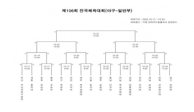 제106회 전국체육대회 야구(일반부)가 17일(금) 기장 현대차드림볼파크 천연잔디구장에서 개막한다. ◎경기안내(17일) <1루> <3루> ◇16강전 ▲대덕대-계명대(9시) ▲유원..