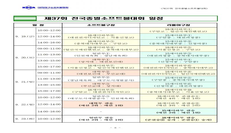 대한야구소프트볼협회(회장 양해영, 이하 협회)가 주최·주관하고 문화체육관광부와 국민체육진흥공단이 후원하는 ‘제37회 전국종별소프트볼대회’가 9.19(금)부터 9.23(화)까지 부산 기장현대차드림볼파크 소프트볼구장과 리틀야구장에서 개최된다. &nbs..