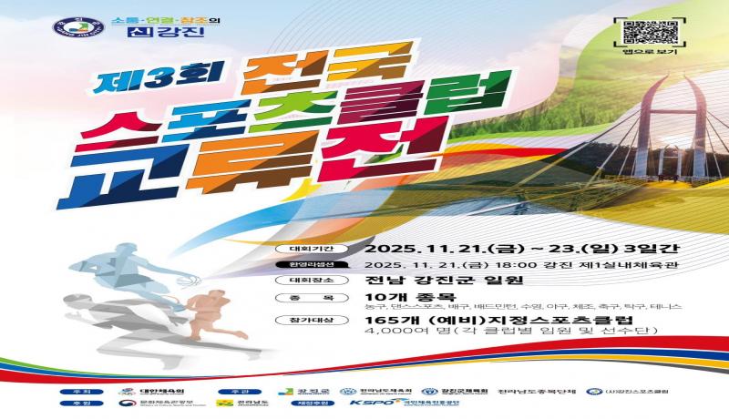 - 11월 21일부터 23일까지 전라남도 강진에서 10종목 경기 열려 대한체육회(회장 유승민)는 전국 스포츠클럽의 화합과 소통의 장인 '제3회 전국스포츠클럽교류전'(이하 ‘교류전’)을 11월 21일(금)부터 23일(일)..