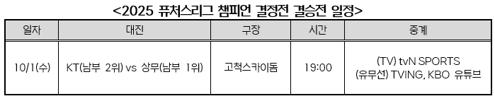 9월 29일(월) 열린 2025 퓨처스리그 챔피언 결정전 준결승전에서 남부리그 2위 KT는 북부리그 1위 한화를, 남부리그 1위 상무는 북부리그 2위 LG를 꺾고 각각 결승 진출에 성공했다.