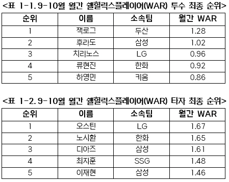 9-10월 월간 ‘쉘힐릭스플레이어’로 선정된 두산 잭로그와 LG 오스틴에게는 한국쉘의 후원으로 시상금 100만원이 지급된다.