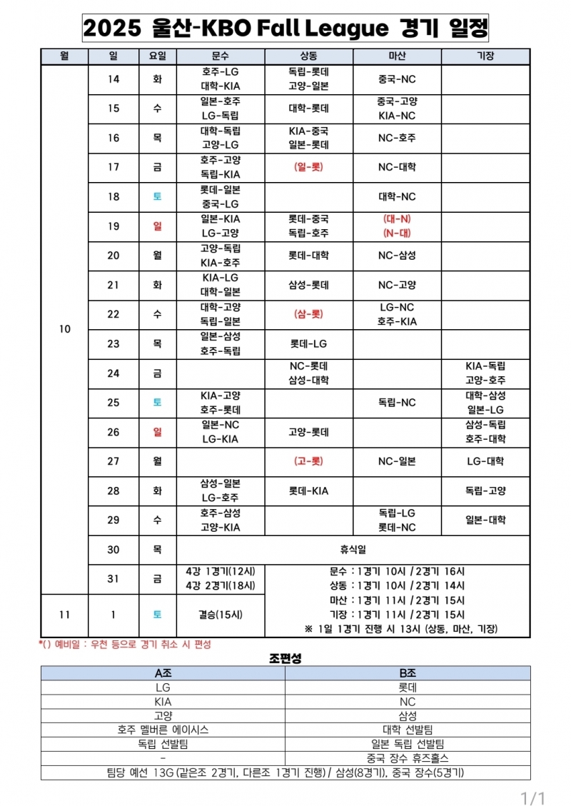 지난해 첫 걸음을 뗀 울산-KBO Fall League는 국내는 물론 해외팀들이 참가해 젊은 선수들의 성장과 국제 교류 활성화라는 두 가지 목표를 이룰 수 있는 무대로 자리매김하고 있다. 국내에서는 KIA, 삼성, LG, 롯데, NC, 고양, 독립리그 올스타, 대학 선발팀 등 8개팀이 참가한다. 해외팀으로는 호주 멜버른 에이시스, 일본 독립리그 선발팀, 중국 CBA 소속 장쑤 휴즈홀쓰가 참가해 총 11개 팀이 10월 14일(화)부터 11월 1일(토)까지 울산 문수구장과 김해 상동구장, 창원 마산구장, 기장 KBO 야구센터에서 약 3주간의 열전에 돌입한다.