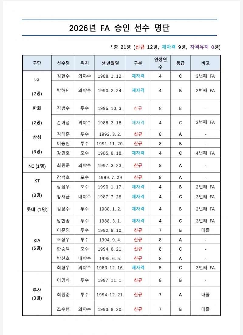 - 2026년 FA 승인 선수 21명, 11월 9일(일)부터 계약 체결 교섭 가능