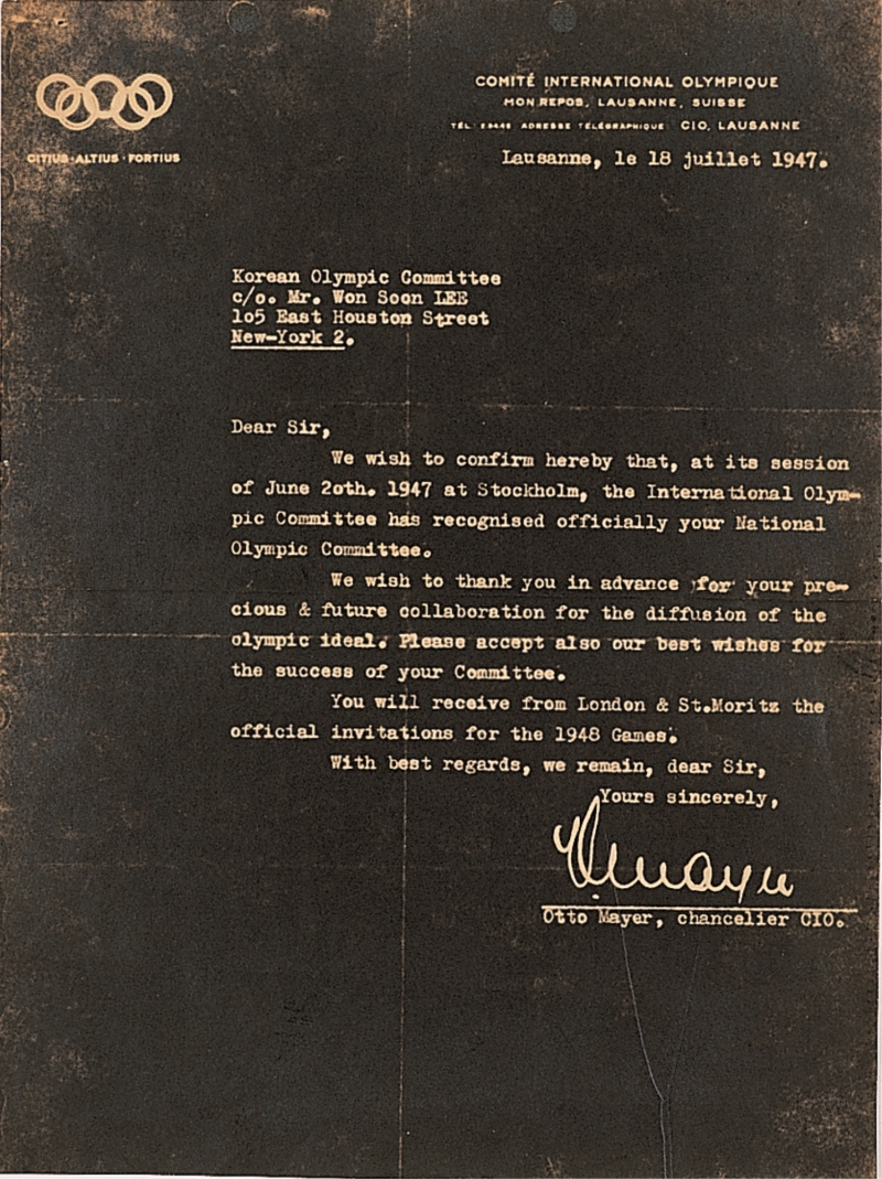 대한체육회 한국체육박물관 유물 사진(IOC 가입승인서). 대한체육회 제공