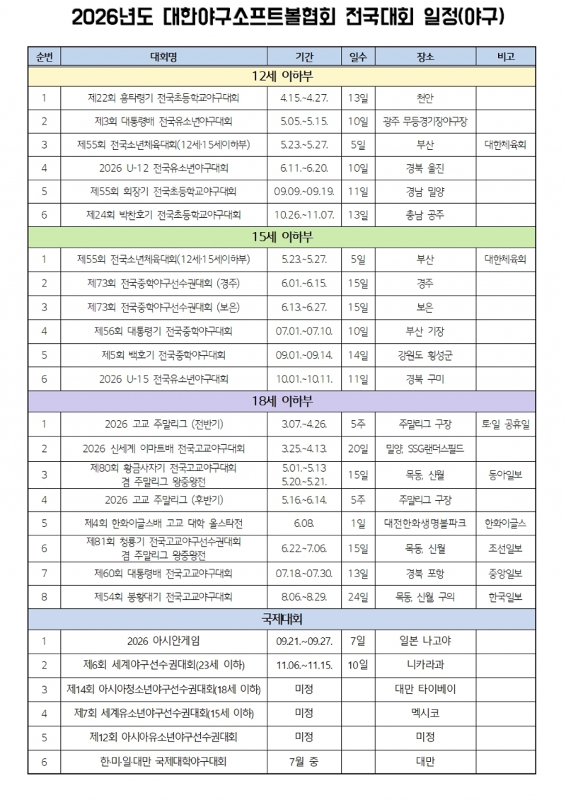 2026년 대한야구소프트볼협회 전국대회 일정(야구)이 확정되었다.