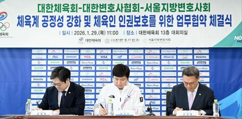 대한체육회(회장 유승민)는 1월 29일(목) 대한변호사협회(협회장 김정욱), 서울지방변호사회(회장 조순열)와 체육계 공정성 강화 및 체육인 인권보호를 위한 업무협약을 체결했다.