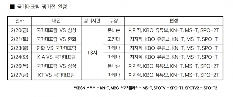 3월에 열리는 월드베이스볼클래식(이하 WBC)에 대비해 일본 오키나와에 훈련 캠프를 차리는 대한민국 국가대표팀의 평가전 일정과 중계가 확정됐다.