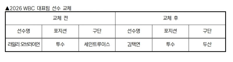 KBO 전력강화위원회는 부상으로 인해 WBC 참가가 어려워진 세인트루이스 라일리 오브라이언을 대체할 선수로 두산 김택연을 확정하고 WBC 조직위에 선수 교체 승인을 요청했다.