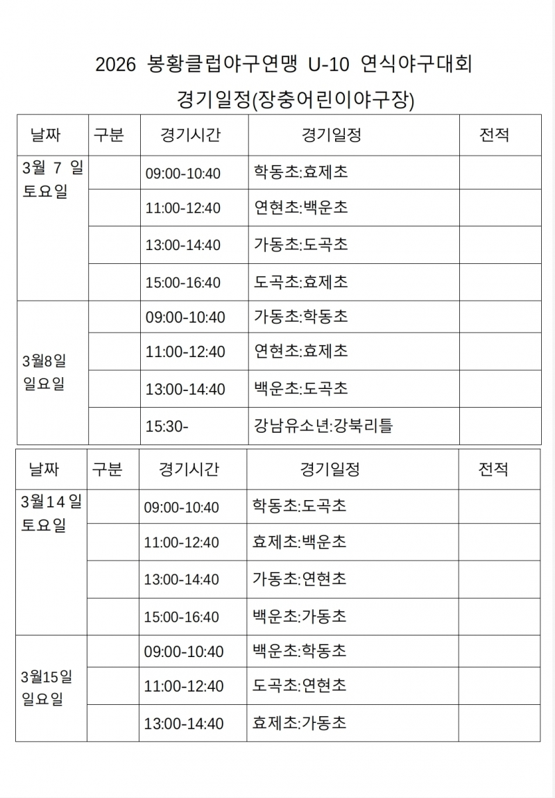 2026 봉황클럽야구연맹 춘계 U-10 연식야구대회(주최:봉황클럽야구연맹)의 일정이 확정되었다.